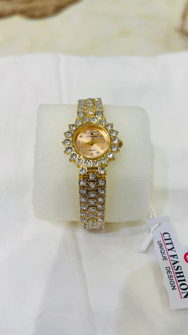Shine with confidence in this elegant crystal-studded gold ladies watch, designed for women who love class and sparkle. Its round dial, golden finish, and double-layered crystal bracelet make it the perfect statement piece for every occasion.