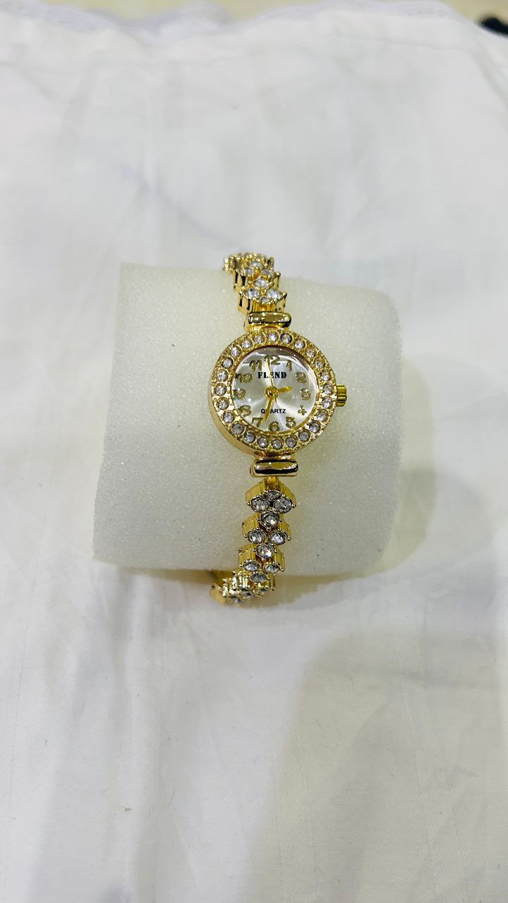 Add a touch of sparkle to your everyday look with this luxury gold crystal ladies watch. Designed with a round diamond-studded bezel and a beautifully detailed crystal bracelet, this piece is the perfect blend of elegance and charm.